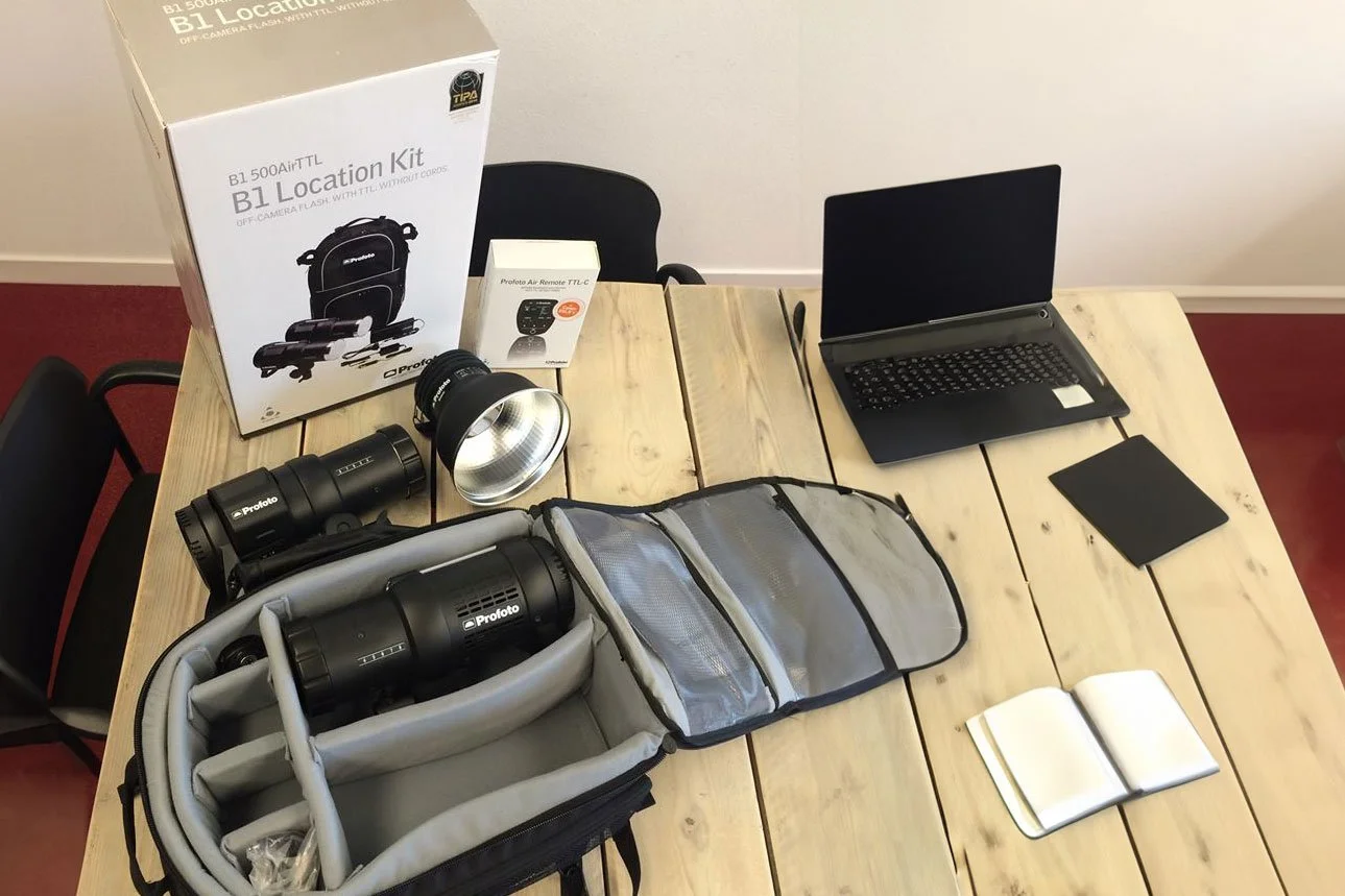Deze week werd de Profoto B1 bij me bezorgd. Ik had m al een tijd op het oog maar zag niet meteen het grote voordeel van deze flitsers in. Zelf werk ik met de Canon 600RT flitsers welke erg krachtig zijn en het meeste werk van mij kunnen doen. Ik merk wel soms dat als je er mee bezig bent dat als je veel flitspower vraagt de batterijen snel leeg gaan en je daardoor soms shots mist. Je kunt dit oplossen door meerdere speedlights samen te voegen tot een grotere flitser maar ook dat kan soms onhandig zijn. Voor extra power heb ik een aantal jaar geleden de Paul C. Buff Einstein gekocht met battery pack en dan heb je ineens 640Ws tot je beschikking. Dit is een hele goede flitser die lichtsterkte kan geven van heel veel tot heel weinig en dat is makkelijk te combineren. Het enige wat me vaak tegen staat is dat je m met stroom moet voorzien of anders een losse batterij hebt hangen aan je statief. Dit is prima als je de set niet verandert maar wanneer je veel buiten bezig bent is dit niet handig.